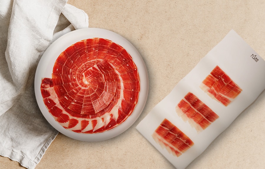 La calidad de una buena pieza también se percibe en el corte del jamón ibérico, que debe llevarse a cabo respetando el ritual y siguiendo los sabios consejos de los maestros cortadores. El interior revela un sinfín de cualidades desde el punto de vista sensorial.