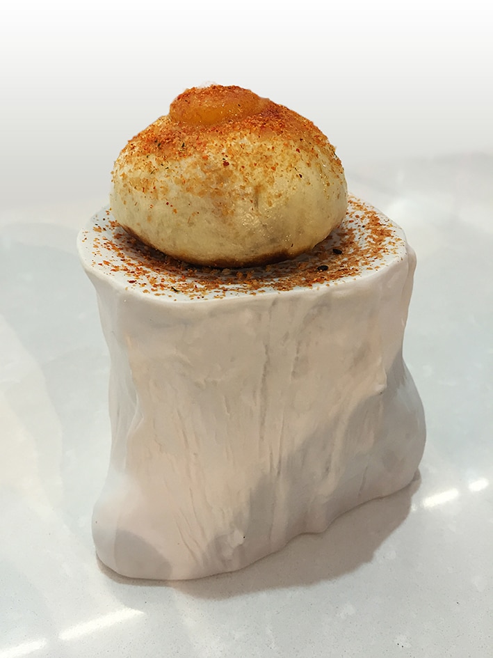 Esta triple fusión se culmina con un huevo de codorniz y pimentón de la vera picante que le dan un necesario punto de contraste por texturas y sabores para completar la tapa que resultó ganadora del premio a la tapa más Vanguardista en el reciente concurso vallisoletano.