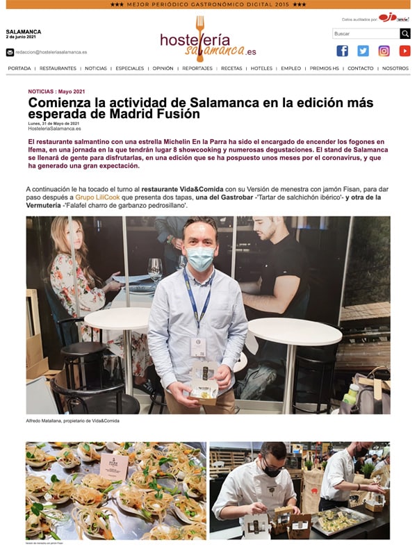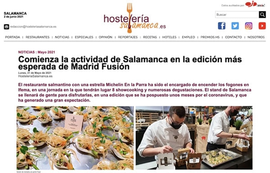 El restaurante salmantino con una estrella Michelin En la Parra ha sido el encargado de encender los fogones en Ifema, en una jornada en la que tendrán lugar 8 showcooking y numerosas degustaciones. El stand de Salamanca se llenará de gente para disfrutarlas, en una edición que se ha pospuesto unos meses por el coronavirus, y que ha generado una gran expectación.