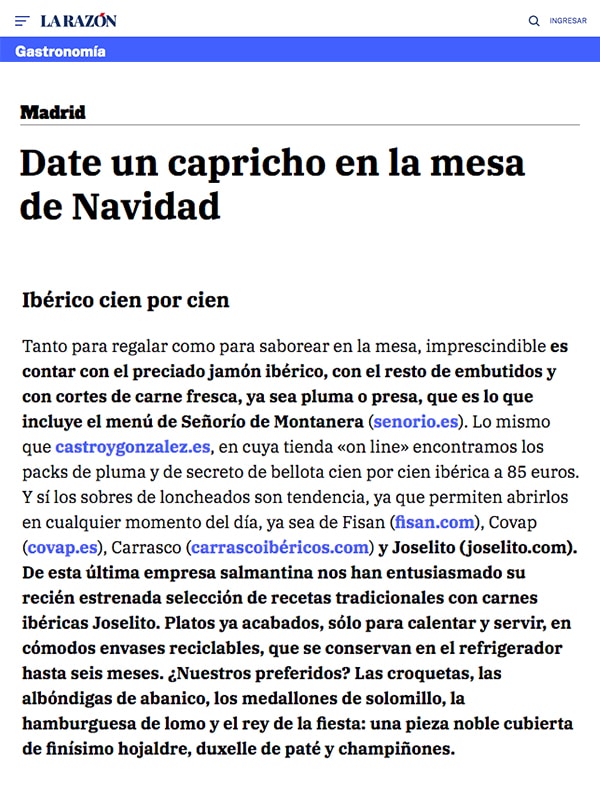 Tanto para regalar como para saborear en la mesa, imprescindible es contar con el preciado jamón ibérico, con el resto de embutidos y con cortes de carne fresca, ya sea pluma o presa, que es lo que incluye el menú de Señorío de Montanera (senorio.es). Lo mismo que castroygonzalez.es, en cuya tienda «on line» encontramos los packs de pluma y de secreto de bellota cien por cien ibérica a 85 euros. Y sí los sobres de loncheados son tendencia, ya que permiten abrirlos en cualquier momento del día, ya sea de FISAN (fisan.com) u otros.