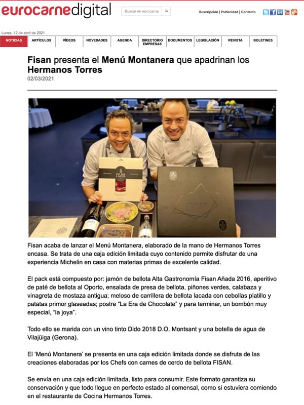 FISAN acaba de lanzar el Menú Montanera, elaborado de la mano de Hermanos Torres encasa. Se trata de una caja edición limitada cuyo contenido permite disfrutar de una experiencia Michelin en casa con materias primas de excelente calidad.