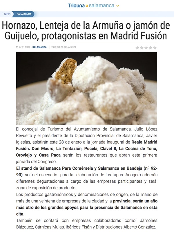 FISAN / Blog / Actualidad / Publicaciones / Hornazo, Lenteja de la Armuña o jamón de Guijuelo, protagonistas en Madrid Fusión