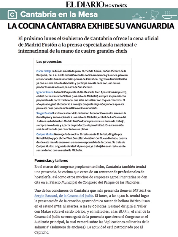 Ponencias y Talleres con uno de los mejores cocineros de Cantabria que más presencia tiene en MF 2018 es Sergio Bastard, el lunes a las 13,00h. tendrá lugar la presentación de la creación gastronómica tartar de bellota ibérico Fisan
