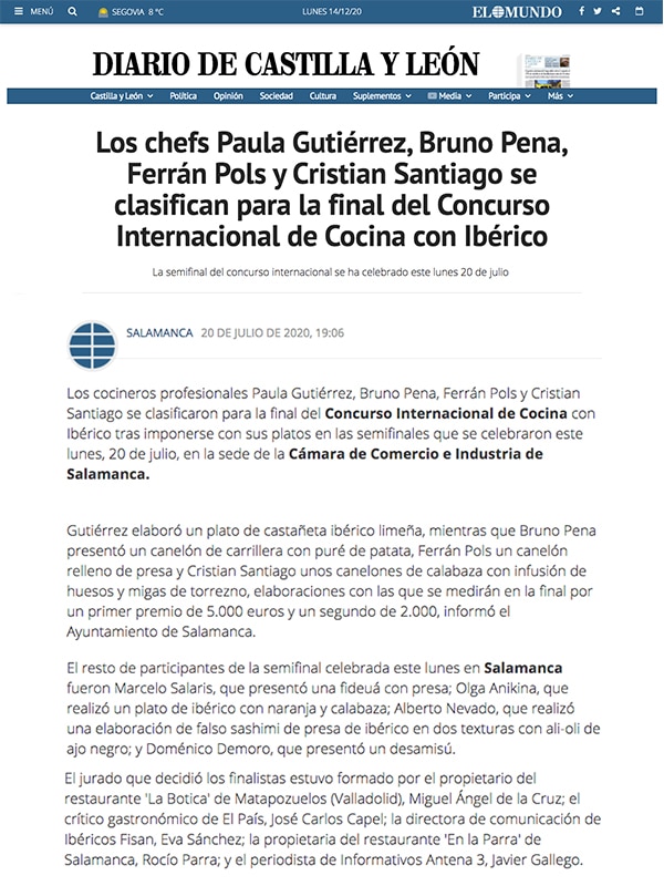 Los cocineros profesionales Paula Gutiérrez, Bruno Pena, Ferrán Pols y Cristian Santiago se clasificaron para la final del Concurso Internacional de Cocina con Ibérico tras imponerse con sus platos en las semifinales que se celebraron este lunes, 20 de julio, en la sede de la Cámara de Comercio e Industria de Salamanca.