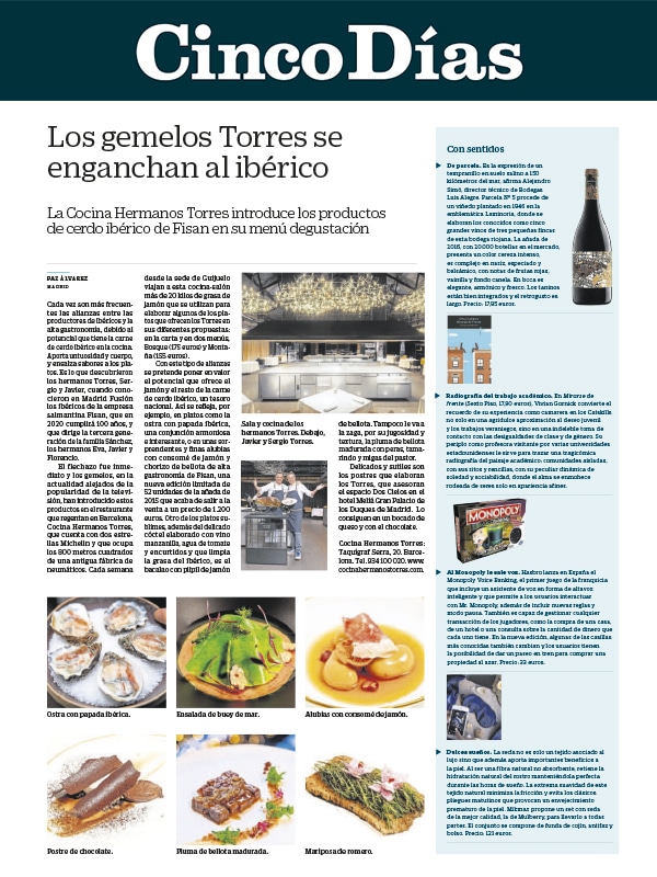 Cada vez son más frecuentes las alianzas entre las productores de ibéricos y la alta gastronomía, debido al potencial que tiene la carne de cerdo ibérico en la cocina. Aporta untuosidad y cuerpo, y ensalza sabores a los platos. Es lo que descubrieron los hermanos Torres, Sergio y Javier, cuando conocieron en Madrid Fusión los ibéricos de la empresa salmantina Fisan, que en 2020 cumplirá 100 años, y que dirige la tercera generación de la familia Sánchez, los hermanos Eva, Javier y Florencio.