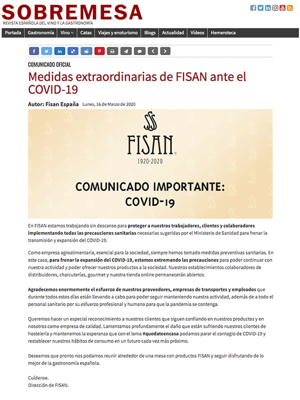 En FISAN estamos trabajando sin descanso para proteger a nuestros trabajadores, clientes y colaboradores implementando todas las precauciones sanitarias necesarias sugeridas por el Ministerio de Sanidad para frenar la transmisión y expansión del COVID-19.