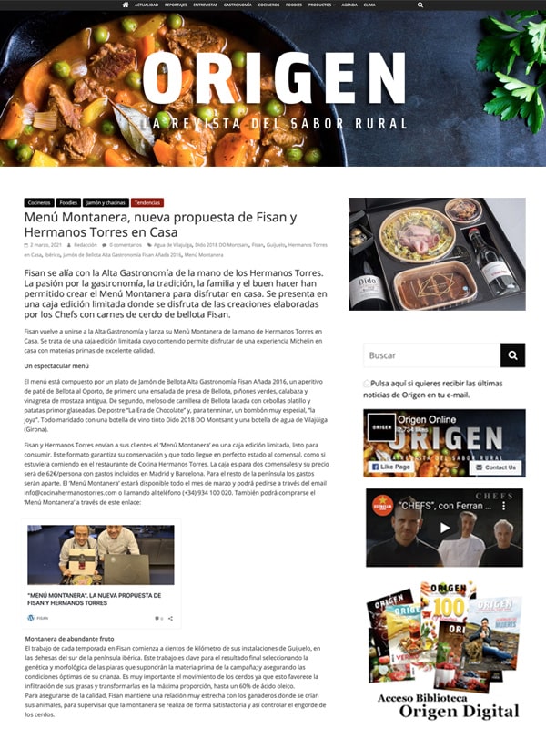 FISAN se alía con la Alta Gastronomía de la mano de los Hermanos Torres. La pasión por la gastronomía, la tradición, la familia y el buen hacer han permitido crear el Menú Montanera para disfrutar en casa. Se presenta en una caja edición limitada donde se disfruta de las creaciones elaboradas por los Chefs con carnes de cerdo de bellota FISAN.