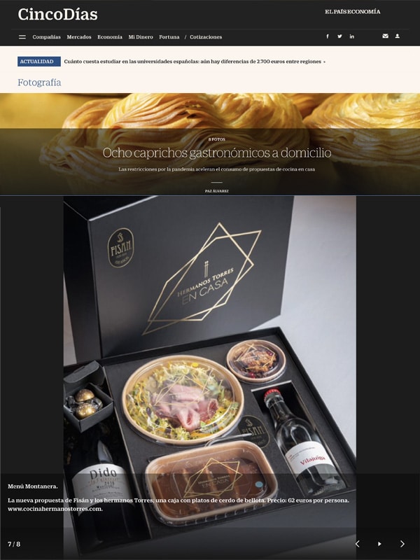 La nueva propuesta de FISAN y los hermanos Torres; una caja con platos de cerdo de bellota. Precio: 62 euros por persona. www.cocinahermanostorres.com.