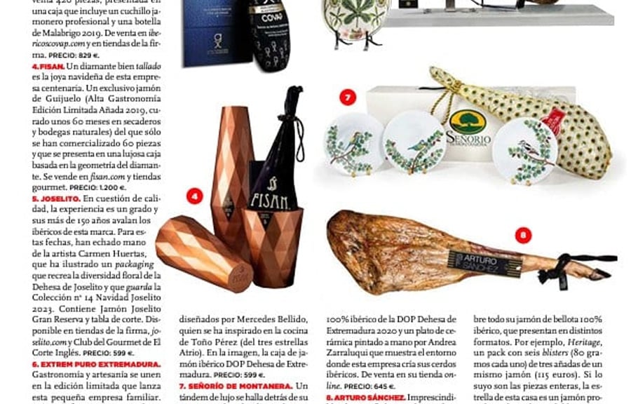 Fisan junto a otras firmas de jamón, reúnen sus productos más exquisitos para poder repartir unas navidades muy especiales. Ediciones limitadas, cajas con la colaboración especial de artistas, estuches de lujo, ‘packagings’ singulares… Para más información las estrellas de esta navidad: