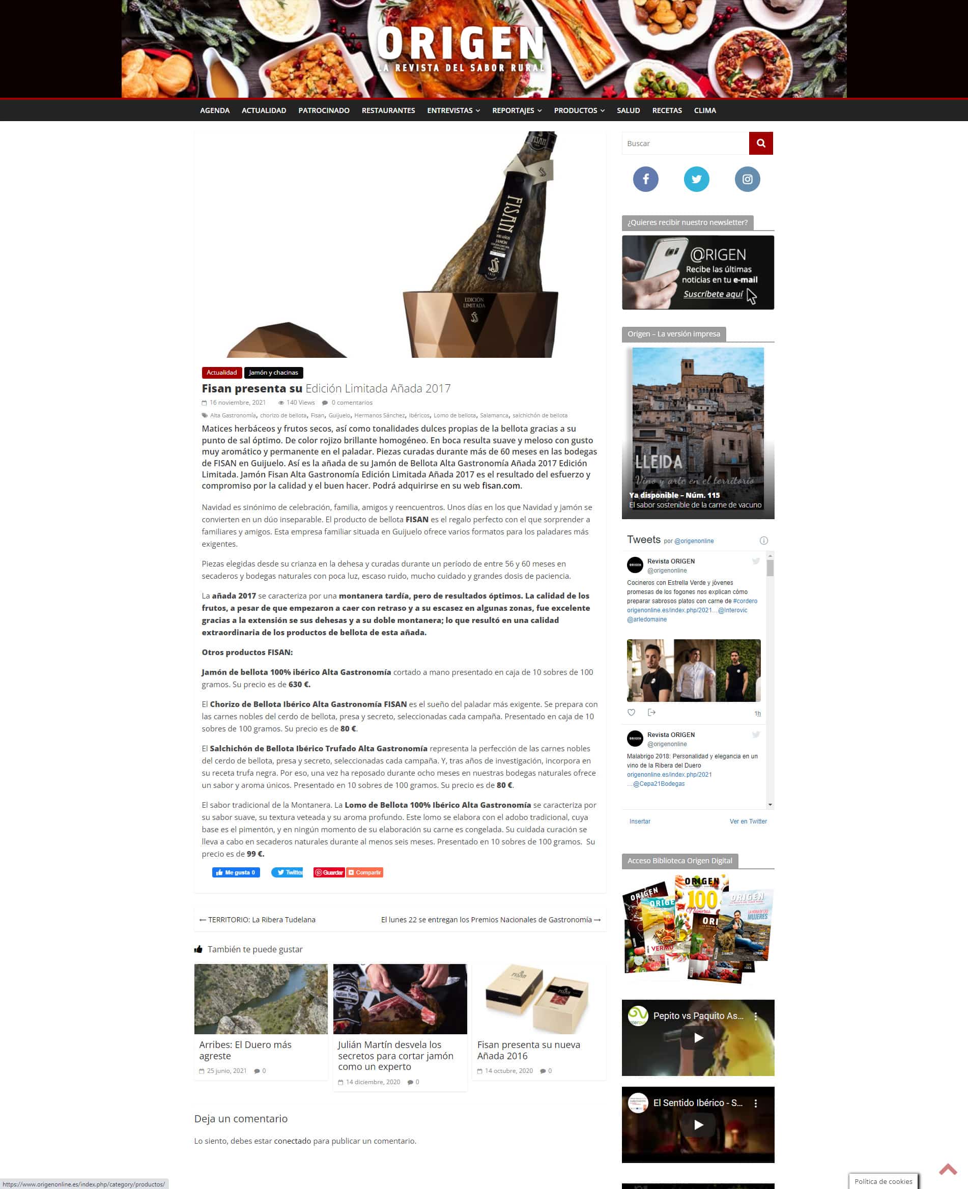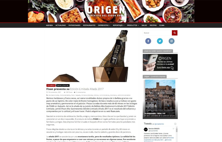 Origen dedica un artículo completo a la presentación del Jamón Alta Gastronomía FISAN Edición Limitada Añada 2017, explicando todos los detalles de un jamón tan especial.
