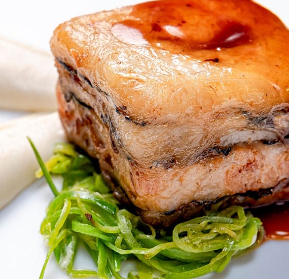 - Milhojas de papada de bellota, trufa melanosporum y crema de raíces