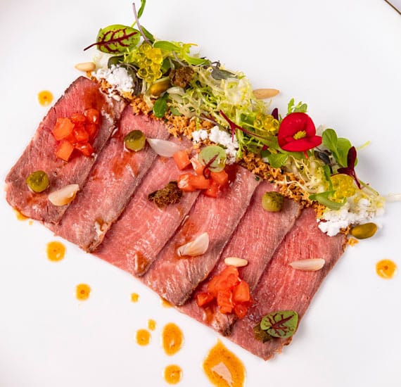 - Rosbif de presa de bellota con encurtido, migas de pastor y concassé de tomate