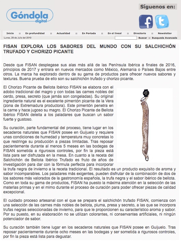 Desde que FISAN desplegase sus alas más allá de las Península Ibérica a finales de 2016, principios de 2017 y entrara en nuevos mercados como México, Alemania o Países Bajos entre otros. La marca ha explorado dentro de su gama de productos para ofrecer nuevos sabores y texturas. Buena prueba de ello son su salchichón trufado y chorizo picante.