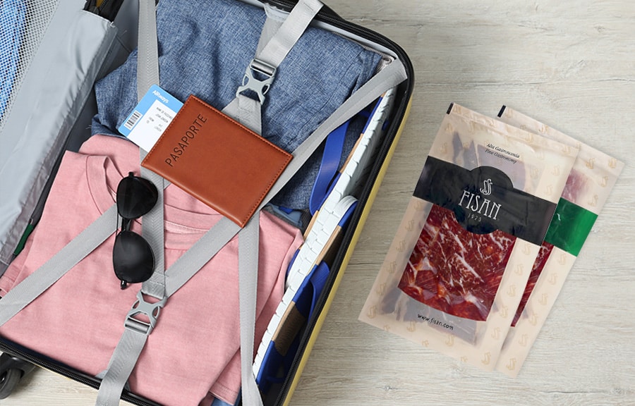 Por otro lado, tanto para preservar la frescura del producto lo recomendable es viajar con el jamón loncheado o cortado a mano envasado al vacío. De esta manera, además de mantenerlo en perfectas condiciones de conservación, también podrás ajustar la cantidad que quieres llevar calculando el número de sobres de jamón ibérico que meterás en tu equipaje de mano o en la maleta.