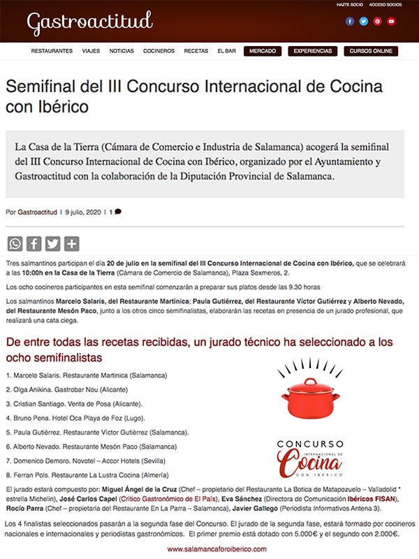 La Casa de la Tierra (Cámara de Comercio e Industria de Salamanca) acogerá la semifinal del III Concurso Internacional de Cocina con Ibérico, organizado por el Ayuntamiento y Gastroactitud con la colaboración de la Diputación Provincial de Salamanca.