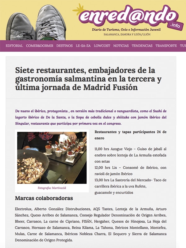 Un listado de Siete restaurantes embajadores de la gastronomía salmantina en la tercera y última jornada de Madrid Fusión, con tapas participantes y Marcas colaboradoras como Fisan.
