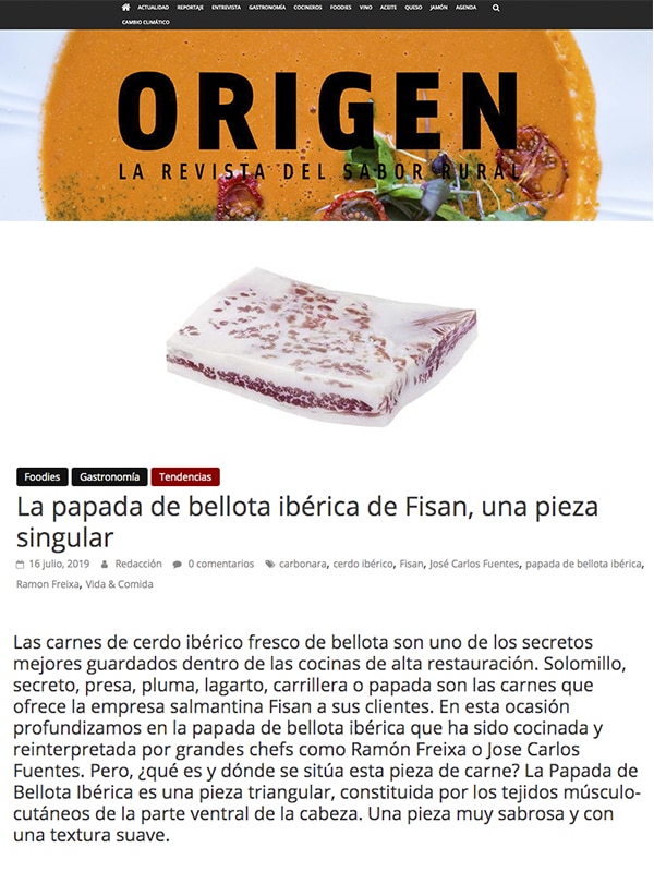 Las carnes de cerdo ibérico fresco de bellota son uno de los secretos mejores guardados dentro de las cocinas de alta restauración. Solomillo, secreto, presa, pluma, lagarto, carrillera o papada son las carnes que ofrece la empresa salmantina Fisan. Profundizamos en la papada de bellota ibérica cocinada y reinterpretada por grandes chefs como Ramón Freixa. Pero, ¿qué es y dónde se sitúa esta pieza de carne? Es una pieza triangular, constituida por los tejidos músculo-cutáneos de la parte ventral de la cabeza. Una pieza muy sabrosa y con una textura suave.