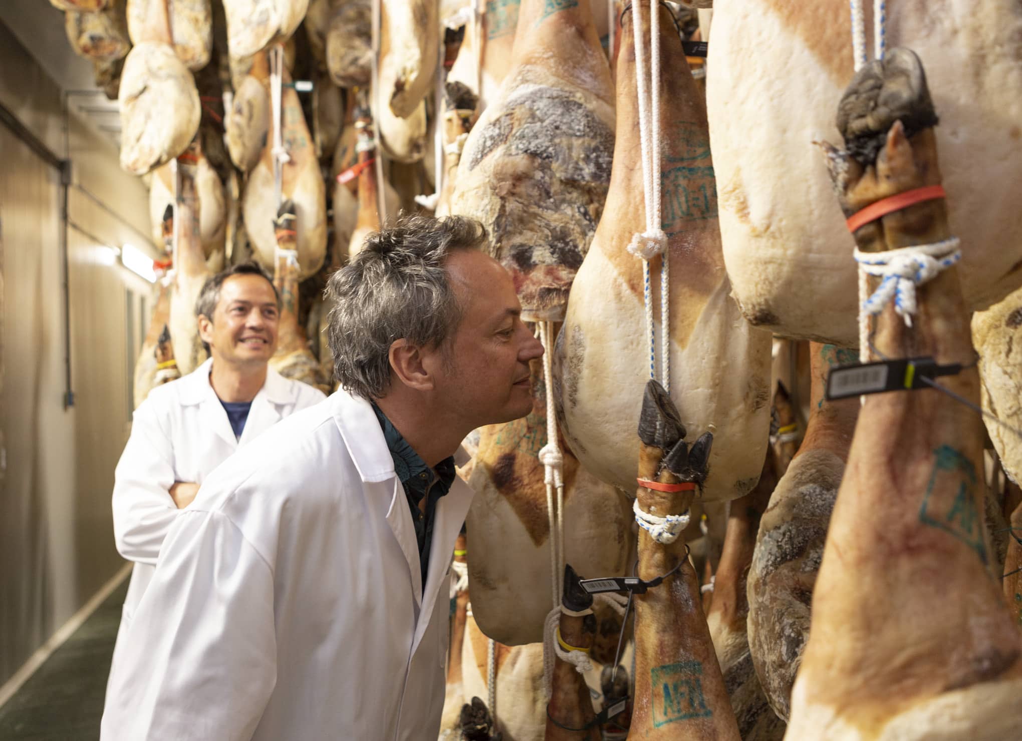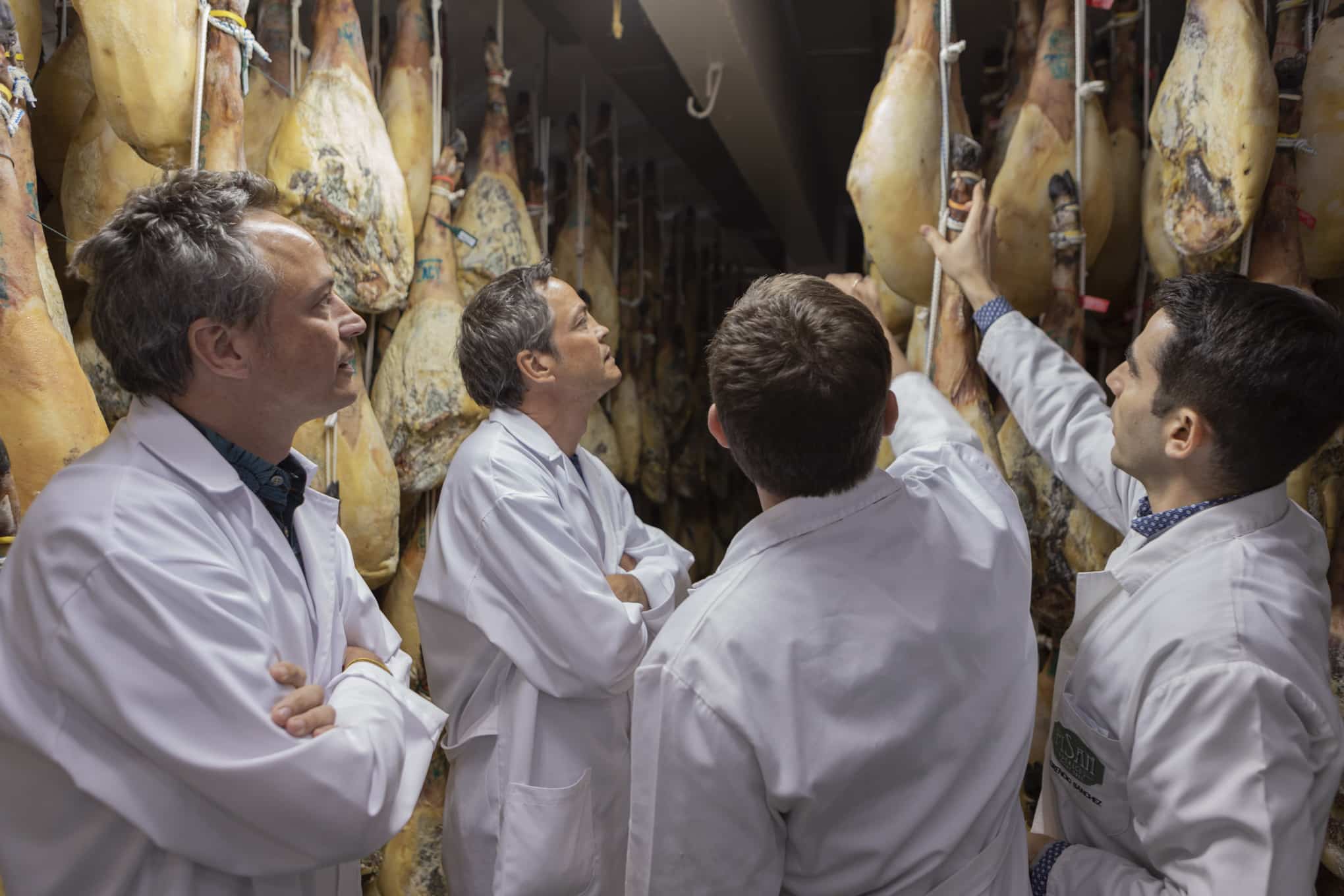 La planta de elaboración en junio es un bullicio de actividad: movimiento de jamones, envasado, etiquetado, expedición… y aparecen los dos hermanos: grandes chefs, empresarios y mejores personas. Todos los empleados están felices por esta visita; se trata de poner cara al final de su cadena de producción.