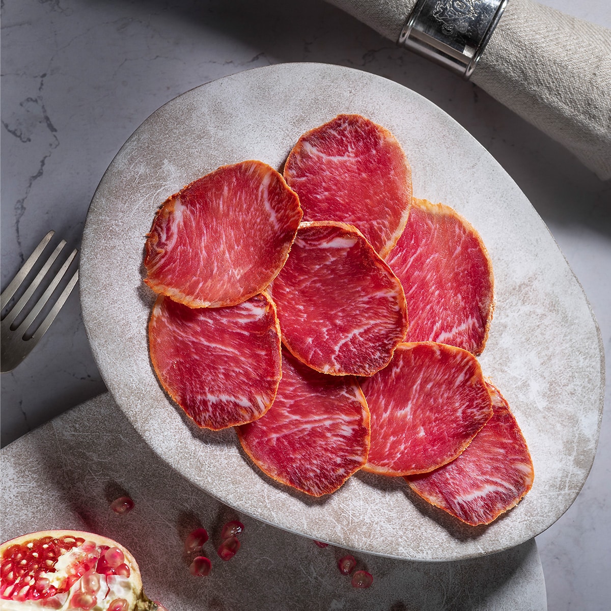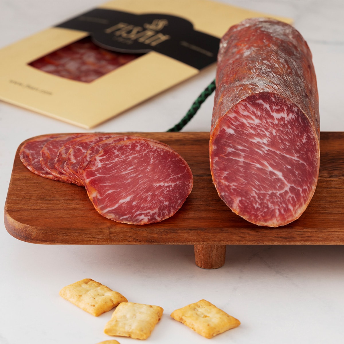 Die 100% Iberico Bellota Luftgetrocknete Lende FISAN zeichnet sich durch ihren milden Geschmack, ihre Maserung und ihr tiefgehendes Aroma aus. Diese Lende wird traditionell mit Paprika mariniert, und das Fleisch wird zu keinem Zeitpunkt tiefgefroren. Anschließend reift sie mindestens sechs Monate in natürlichen Trockenräumen. 100% natürlich