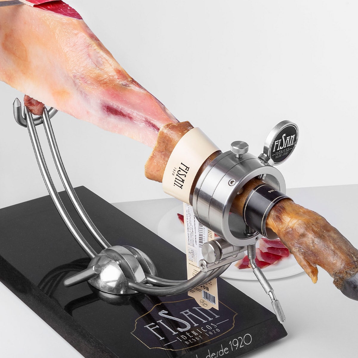 Dank seiner Bauweise ermöglicht dieser Schinkenhalter den kompletten Verzehr und Genuss des (Vorder-)Schinkens dank seiner großen sowohl horizontalen als auch vertikalen Beweglichkeit.