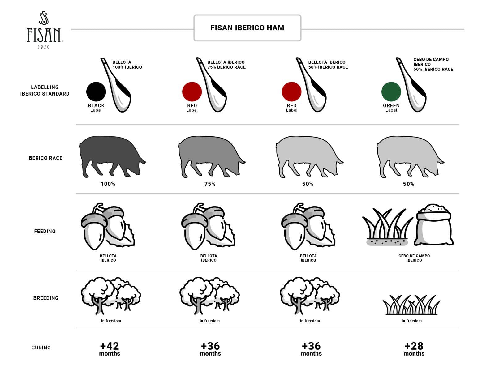 1. The pig’s mother and father are 100% Iberian breed, or the mother can be 100% Iberian breed and the father 50% Iberian breed (the result being 75% Iberian breed), or a Duroc pig (the result being 50% Iberian breed).
